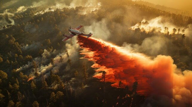 An aerial firefighting tanker dropping retardant on a forest fire, deploying strategic aerial suppression tactics to contain the blaze.