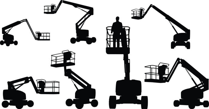 Construction boom lift silhouette vector illustration, aerial work platform vehicle, industrial equipment for height work, maintenance and building operation, safety engineering concept