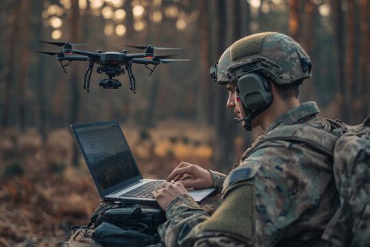 Soldier operating a drone with a tablet in a military environment during a training exercise