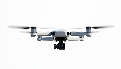 Isolated drone hovers mid-air on clean transparent background. Modern UAV hexacopter with camera, gimbal, rotating propellers for aerial photography or video. Tech concept of copter, unmanned vehicle.