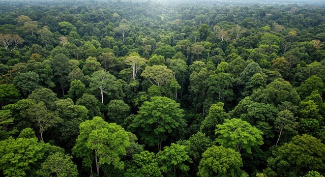 Vast, lush green rainforest canopy stretches to the horizon, showcasing dense, vibrant foliage under a hazy sky, evoking natural wonder and untouched wilderness