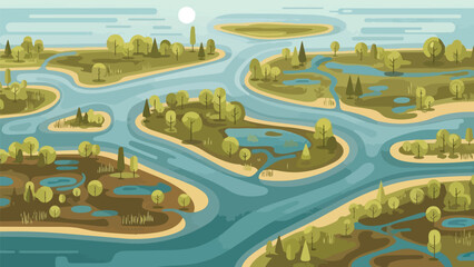 A serene flat design illustration showcasing an intricate river meandering through lush, green islands and wetlands under a soft sky