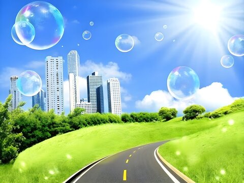 A Frutiger Aero style background featuring a green field with clouds and bubbles, presenting a clean and modern design with an airy and whimsical aesthetic.