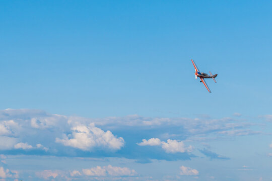 Small retro airplane, light aircraft flying in blue cloudy sky and doing stunts at Air Show. Performance, extreme, aerobatic and sport concept