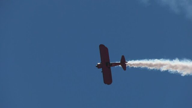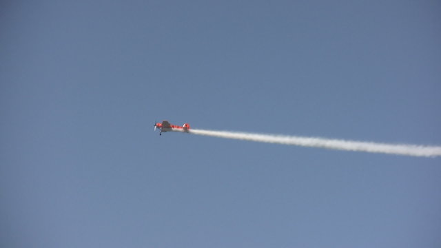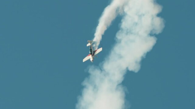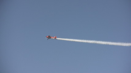 Aerobatics with Stunt plane and white smoke trail