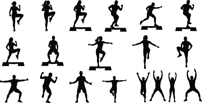 Silhouette people doing fitness workout, aerobic exercise, step training, cardio routine, gym activity, active lifestyle, group training, health, wellness
