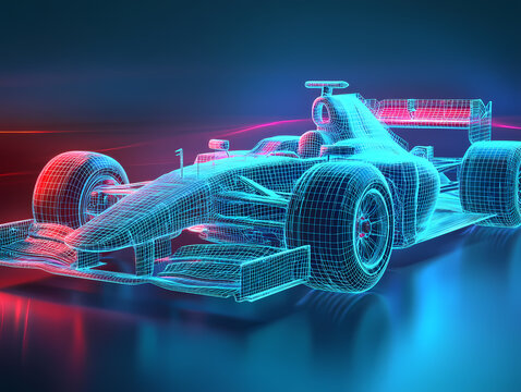 Formula Racing Car's Blueprint: A futuristic perspective of a formula racing car is illustrated with neon outlines, showcasing its sleek design and aerodynamic form against a dark, dynamic backdrop.