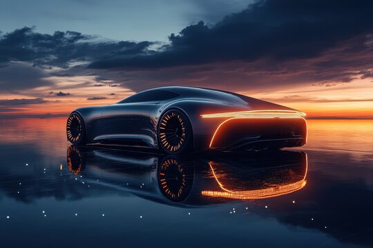 A minimalist luxury car gleams in metallic sheen, its chic form slicing a glowing night sky
