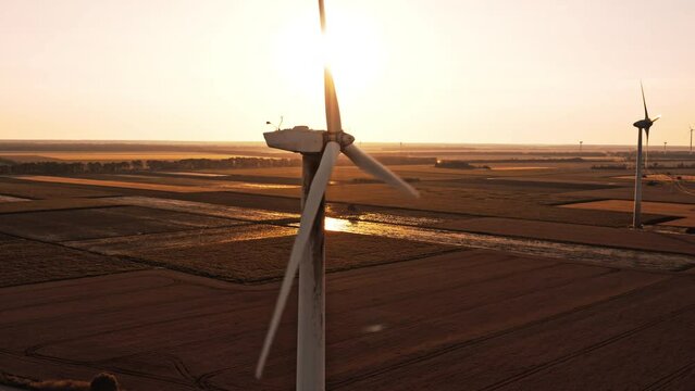 Green Field with Wind Turbines at Golden Sunrise Generating Sustainable Energy Aerial View of a Rural Landscape with Renewable Resources