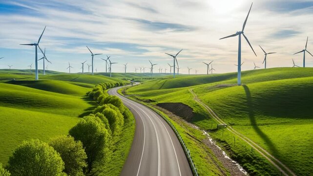 A scenic view of wind turbines dotting a green, rolling landscape under a bright sky, showcasing renewable energy generation