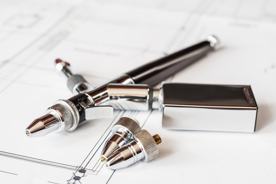 Airbrush with interchangeable nozzles and drawings on the table.