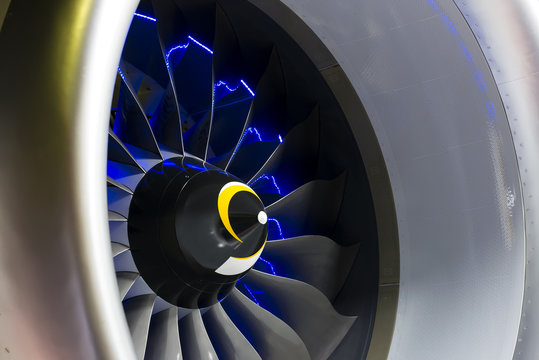 Close-up view of a jet engine in an aircraft maintenance hangar. Engine turbine details and industrial workshop setting.