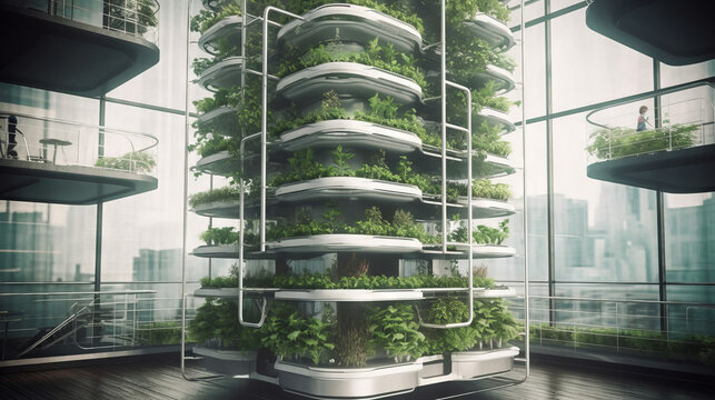 Vertical farming with hydroponic and aeroponic plants which is fully automated, generative ai