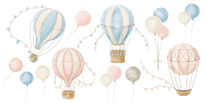 Bright aerostat isolated on white background. Vintage l hot air balloon with colored flags. Watercolor hand drawn illustration. Ideal for romantic design, children's decor.