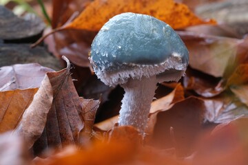 Close up mushroom Stropharia aeruginosa (verdigris agaric, blue-green stropharia, Verdigris Roundhead) in forest