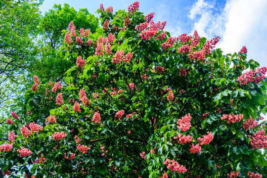 Red horse chestnut (Aesculus carnea) blossoming at spring