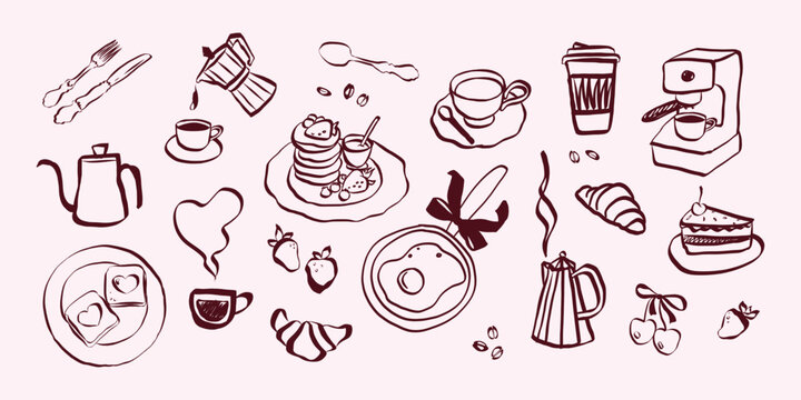 Whimsical breakfast doodles. Vintage hand drawn icons with la dolce vita aesthetic in simple crayon and sketch style. Trendy art for menus and dinner brunch invitations. Ink vector illustration