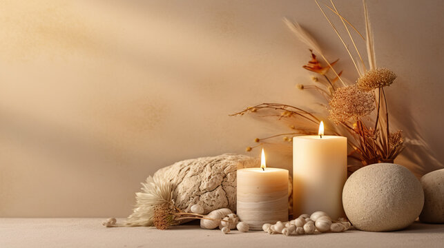Burning candle on beige background. Warm aesthetic composition with stones and dry flowers. Home comfort, spa, relax and wellness concept. Interior decoration
