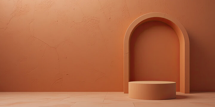 Minimal arched background with warm terracotta wall and round podium under natural sunlight, modern architectural design for product display, elegant composition and clean aesthetic concept