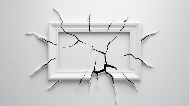 Cracked frame on white wall: surreal art emphasizing fragility and creativity
