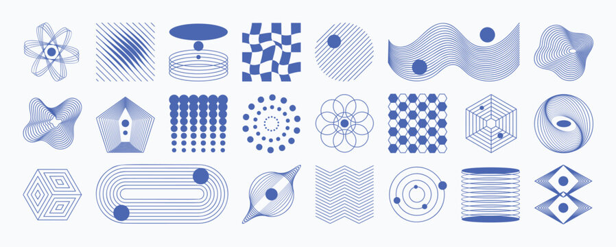 Big vector set of brutalist geometric shapes. Trendy abstract minimalist figures, stars, flowes, circles. Modern abstract graphic design elements.Vector illustration