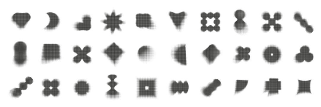 Halftone effect Y2K brutal shapes set. Collection of black dotted geometric elements