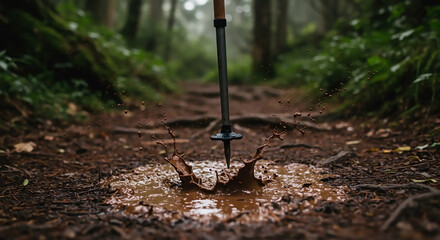 Mud Splatter on Hiking Trail Trekking Pole in Action