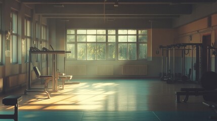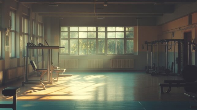 Sunlight Streams Into Empty Gym Through Large Windows