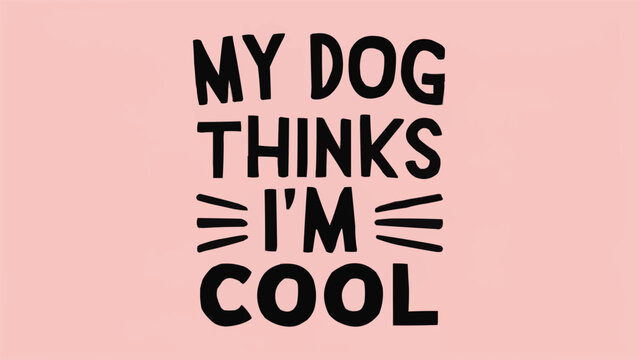 My dog thinks I'm cool lettering. Funny dog mom quotes for women. Dog and puppy lovers sarcastic gift idea. Cute aesthetic black, beige and pink text vector for shirt design and printable accessories.