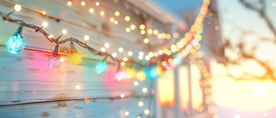 Colorful string lights illuminate a wooden wall at sunset, creating a warm and inviting atmosphere for festive celebrations.