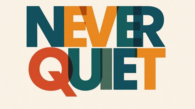 Bold typography design featuring the words 'NEVER QUIET' in vibrant colors. The letters are large and modern, creating a striking visual impact.