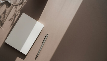 Minimalist workspace with a blank white notebook and pen for journaling or planning, set on a beige desk with artistic sunbeam shadows creating a peaceful, aesthetic mood