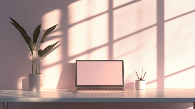Laptop sits on geometric background with colorful cube shapes