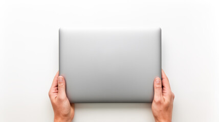 Sleek laptop silver computer minimalist design white background human hands modern device portable technology top view clean aesthetic workspace vibe gently inspire focus and calm