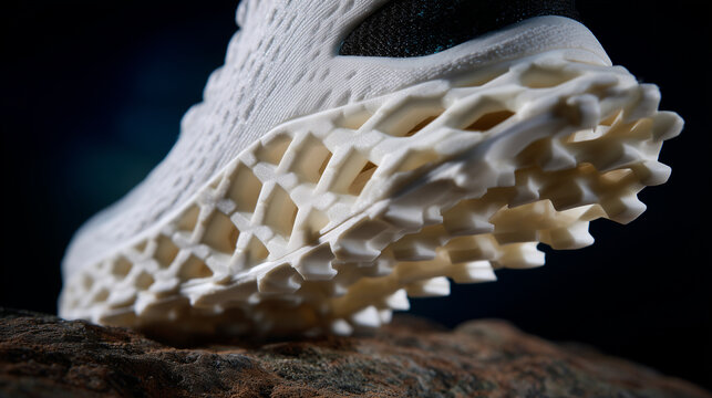 Close-up of a clean white sneaker sole with a geometric textured pattern, crisp edges and soft directional lighting highlighting modern footwear design and active lifestyle aesthet