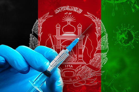 Afganistan Covid-19 Vaccination Campaign. Hand in a blue rubber glove holds a syringe with covid-19 virus vaccine in front of Afganistan flag