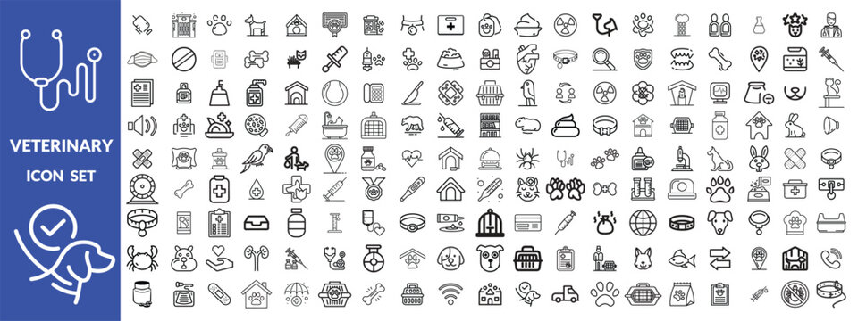 Veterinary icon set. Contains such icons as pets, medical history, health care, vet, vaccines, test, dental care, antiparasitic, diagnosis, x ray, veterinary clinic and more. Vector design.