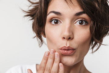 Portrait of affable woman with short brown hair in basic t-shirt covering her mouth with hand