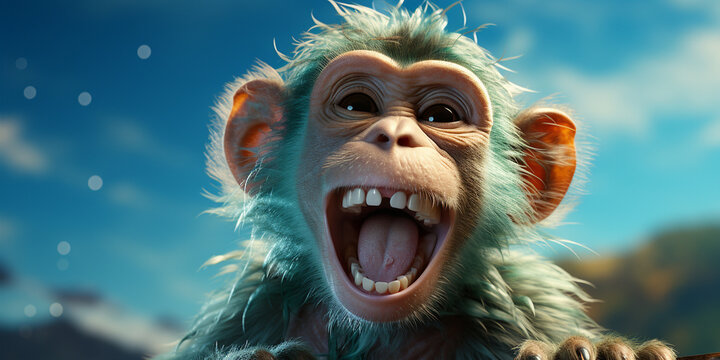 Lustiger Cartoon Schimpase Affe in türkis mit zotteligen fliegenden Fell lacht im Querformat für Banner, ai generativ