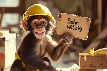 Affe mit einem Bauhelm hält ein Schild hoch auf dem "Sehr witzig" steht. Lustiger Schimpanse  als Grußkarte.
