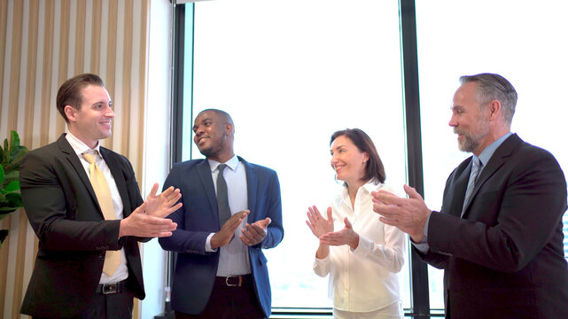 Group of multi national businesspeople having a business discussion and touching a hands together. Happy diverse nationality businessman and businesswoman making a handshake and touching a hands.