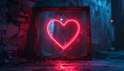 Neon heart sign with pink and blue light glowing on a distressed concrete wall. Representing love, romance, and valentine's day