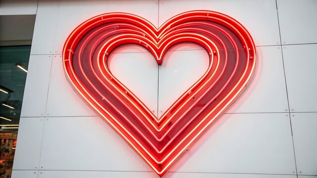 Red neon heart sign symbolizing love and affection on a modern building facade