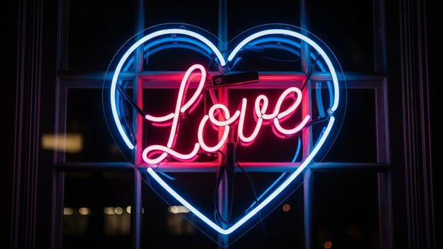 A neon heart sign with the word Love displayed prominently in a dark window at night