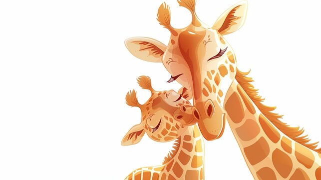 Sweet cartoon illustration of a mother giraffe cuddling her adorable baby, against a clean white background.