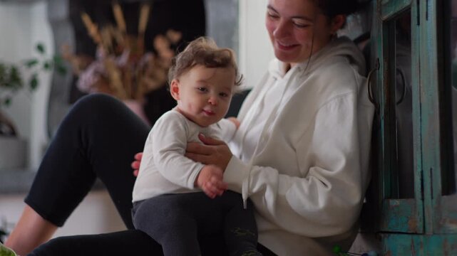 Mother smiling while holding baby on lap, sharing joyful and affectionate moment, expressing warmth, love, and emotional connection between parent and child