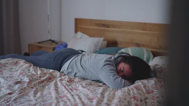Toddler climbing over resting mother on bed during lively morning play showing affectionate family connection, gentle physical closeness, and energetic early-day routine