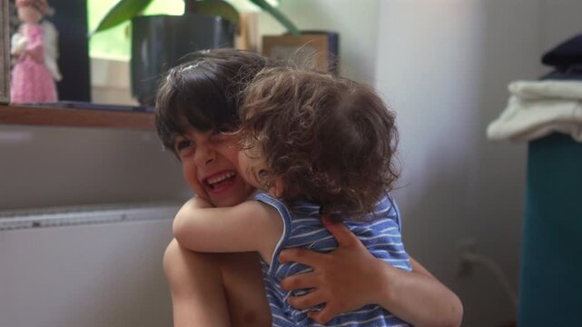 Mother holding toddler and older child together in warm family embrace, smiling softly while both children cuddle close in affectionate moment at home