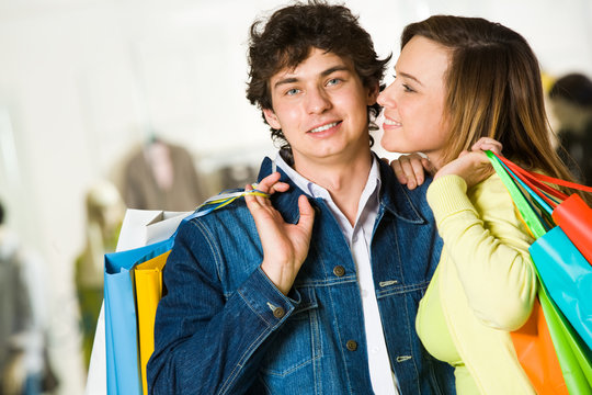 Close up of young gentleman holding hand of young woman while sitting at the table with pink gift box