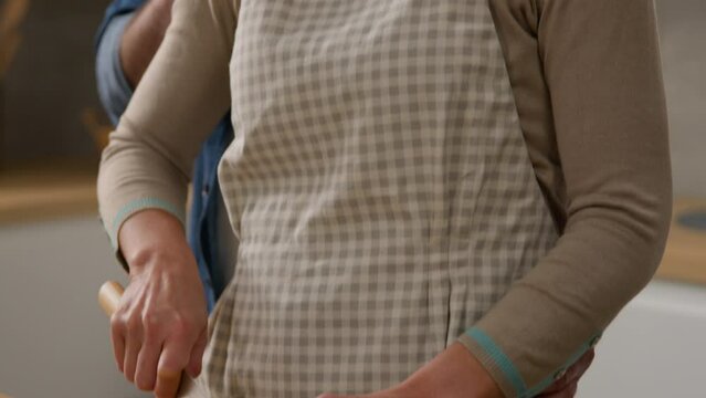 Moving shot happy family Caucasian middle-aged adult at kitchen wife woman cook vegetable salad cut cucumber husband man hugging cuddling embracing couple affectionate bonding tender love healthy food